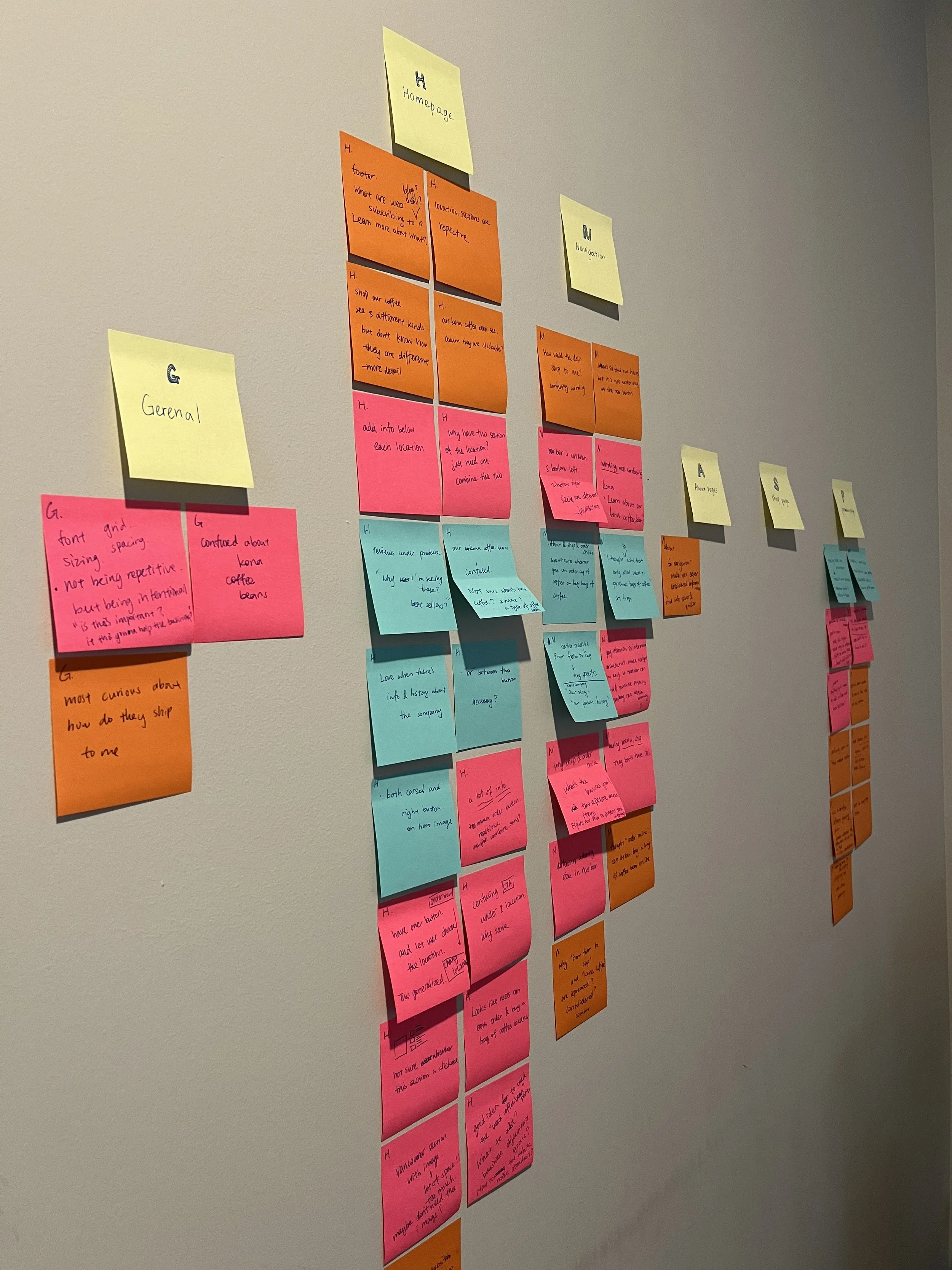 I gathered insights from testers 1-3, distributing each under different categories: General, Homepage, Navigation, About pages, Shop page, and product page.